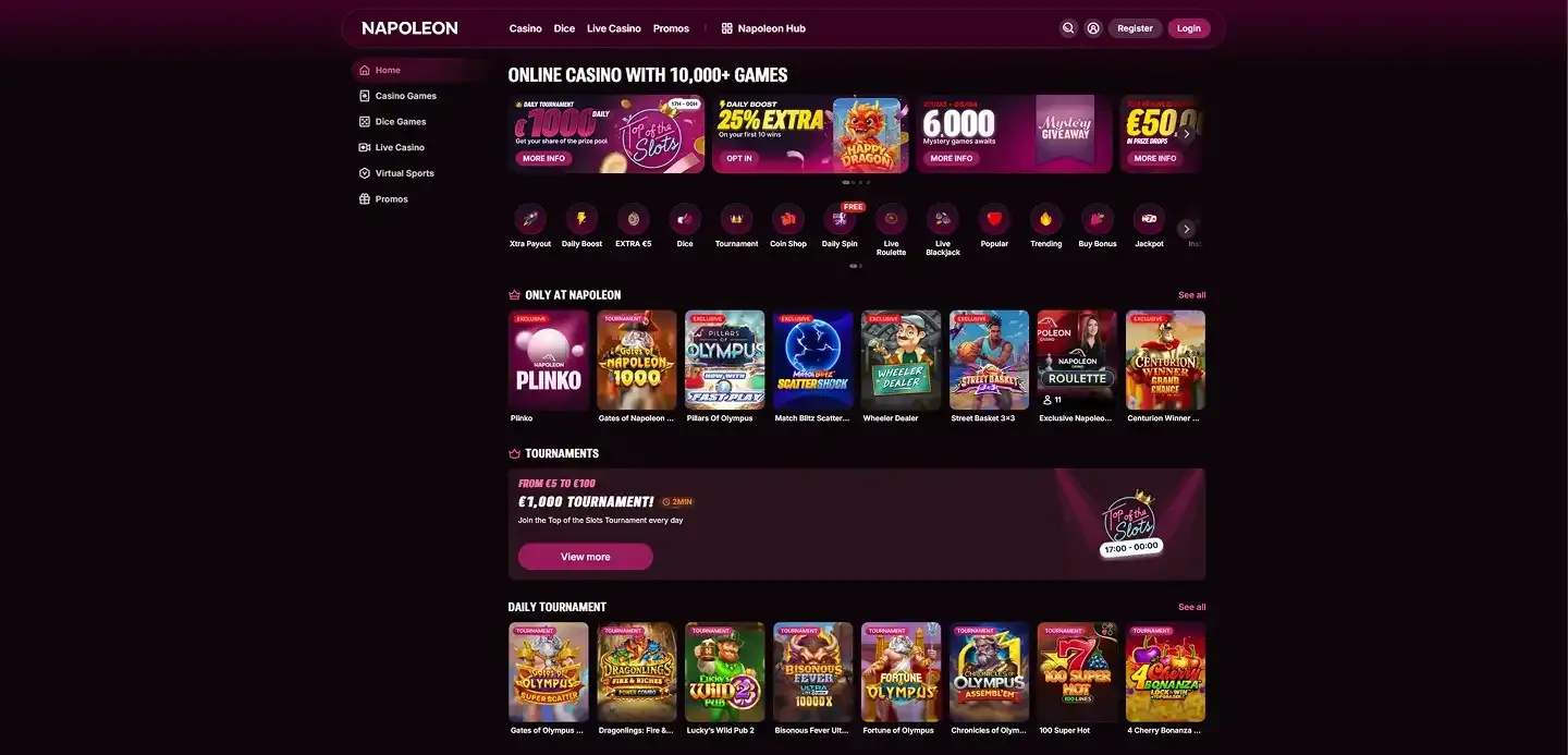 Napoleon Online Casino verwelkomt nieuwe spelers met een aantrekkelijke welkomstbonus bij hun eerste storting. De exacte bonusvoorwaarden en het bedrag kunnen variëren, dus controleer altijd de actuele promoties op de website. Vergeet niet de algemene voorwaarden en inzetvereisten door te lezen voordat u de bonus accepteert.